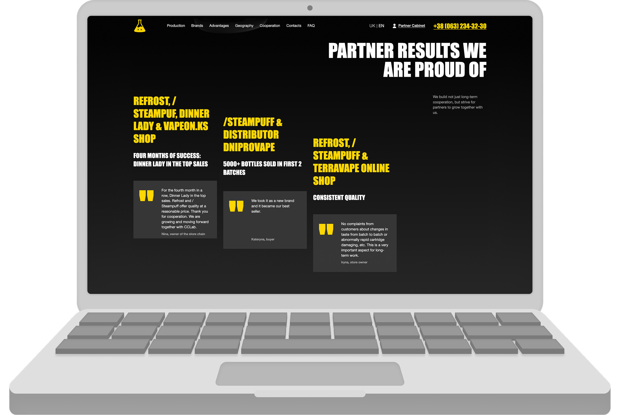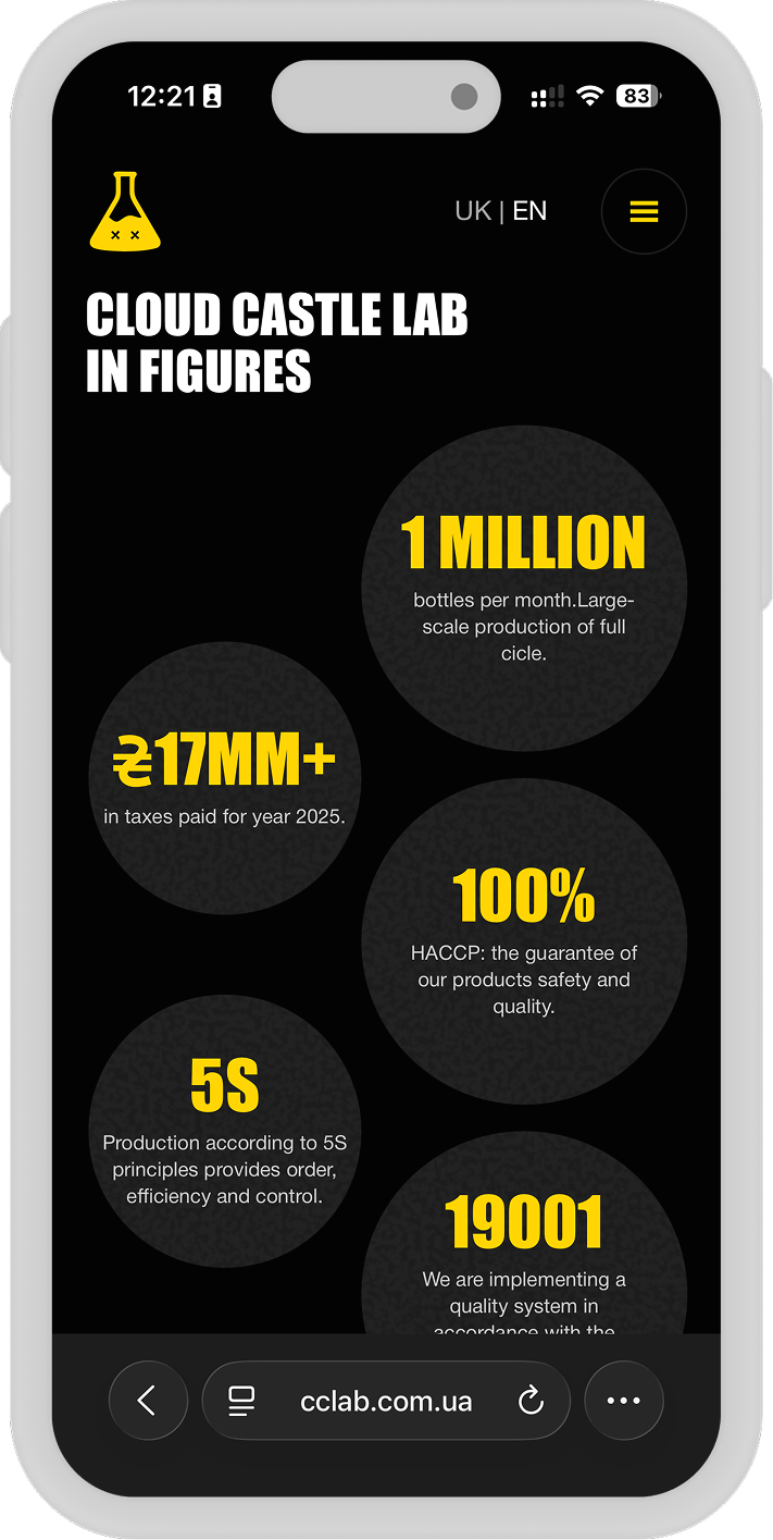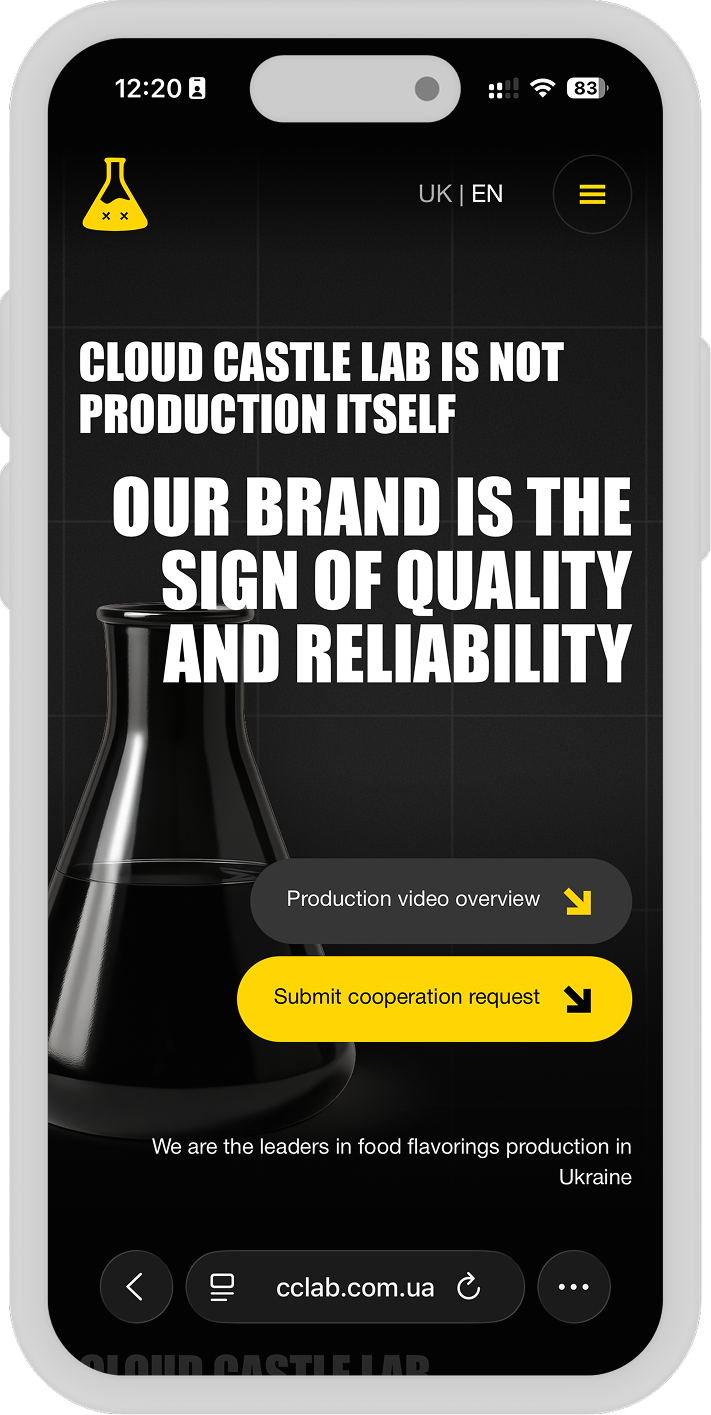 Cloud Castle Lab — провідний український виробник харчових ароматизаторів, якому була необхідна потужна цифрова платформа, що відповідає його статусу на ринку. Команда Momentum Squads реалізувала повний цикл розробки, відмовившись від стандартних шаблонів на користь кастомного рішення, що підкреслює надійність та технологічність бренду. Ми зосередилися на преміальному дизайні в темних тонах, який відображає «лабораторну» специфіку бізнесу, забезпечивши при цьому високу швидкість завантаження та бездоганний UX.
