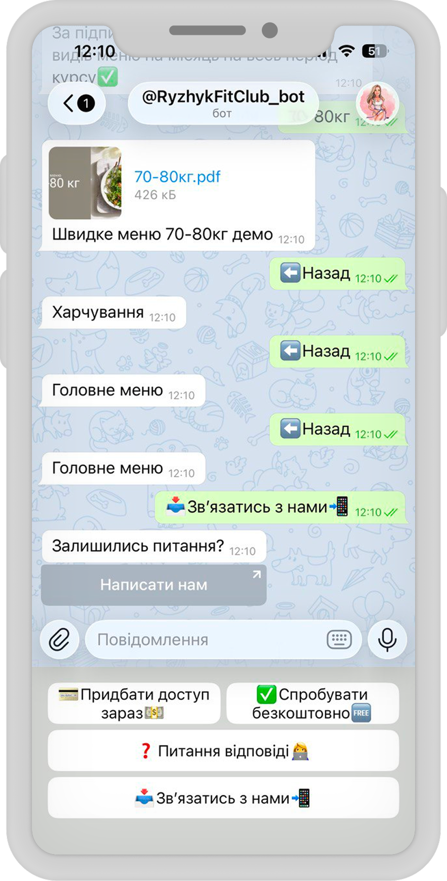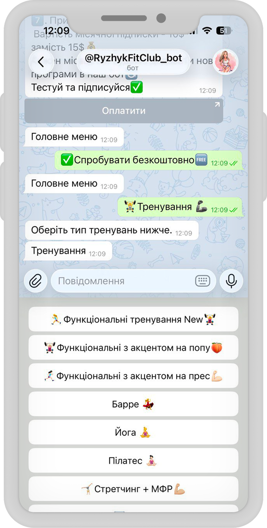 Бот RyzhykFitClub — це яскравий приклад того, як наш кастомний конструктор чатботів перетворює експертні знання на масштабований цифровий продукт. Створений для фітнес-тренерки @ryzhyk_transformation, бот виконує роль кишенькового персонального тренера та дієтолога. Він надає користувачам структуровані програми тренувань за різними напрямками — від йоги до інтенсивних функціональних занять — та персоналізовані плани харчування залежно від вагової категорії.